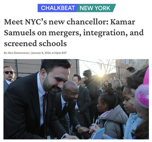 | Top Stories Devil in the Details Meet NYC’s new chancellor: Kamar Samuels on mergers, integration, and screened schools Chalkbeat, 1/8/2026 On Kamar Samuels’ fourth school day as chancellor, he brought Mayor Zohran Mamdani to a Brooklyn school he views as a blueprint for tackling two major problems: segregation and sagging enrollment. …What decides for me whether a school is too small is the resources that it’s able to garner for kids. And there are schools across the city that aren’t able to have the best enrichment programs. An eighth grader might not be exposed to Algebra because they don’t have the resources. That is something we have to take a look at across the city, especially when we think about our class size mandates. …I really believe that a school that’s socioeconomically integrated — especially as we think about our city and the diversity that it brings culturally — is a school that I want my own children, who are in the public school system, to be a part of…that’s the part of school integration that people often miss: We want to make sure that we have high expectations for all kids, and we want to make sure that they feel affirmed in school. Number Overhaul Kamar Samuels says NYC will double down on literacy mandate — but signals changes to math overhaul Chalkbeat, 1/6/2026 A reading curriculum overhaul launched by Mayor Eric Adams isn’t going anywhere, schools Chancellor Kamar Samuels told principals Tuesday. But he signaled changes could be coming to the prior administration’s math mandate. “I completely believe in academic rigor and excellence — that’s why we are doubling down on what we’re doing with New York City Reads,” Samuels told principals during a Tuesday morning webinar, according to a recording obtained by Chalkbeat. “We’re going to probably take a little bit of a different approach to New York City Solves, so you might see some shifts there,” Samuels said of the math mandate. Neither Samuels nor an Education Department spokesperson elaborated on what changes he is considering. Top Priorties NYC schools chief Kamar Samuels signals integration, culturally responsive education as priorities Chalkbeat, 1/5/2026 In a letter to Education Department staff on Monday, New York City schools Chancellor Kamar Samuels began sketching out some of his priorities, including school integration and lessons that reflect the system’s diversity. “I believe that every student — starting in early childhood and continuing through graduation — deserves a school that is academically rigorous, safe, and truly integrated,” Samuels wrote in the letter obtained by Chalkbeat. Families, he added, “should be able to expect that our system reflects New York City’s rich multiculturalism, both through the diversity of our schools and through culturally responsive curriculum and practice.” Advocacy Corner NEW from PLACE NYC PLACE NYC Announces new podcast, Schooled: Inside the Nations Largest School District PLACE NYC, 1/8/2026 To start the new year, PLACE NYC has launched a new free podcast, Schooled: Inside the Nation’s Largest School District. The show will focus on the real issues shaping the future of the nation’s largest school system and the families who depend on it. Listen on Apple podcasts, Spotify, or wherever you get your podcasts. |